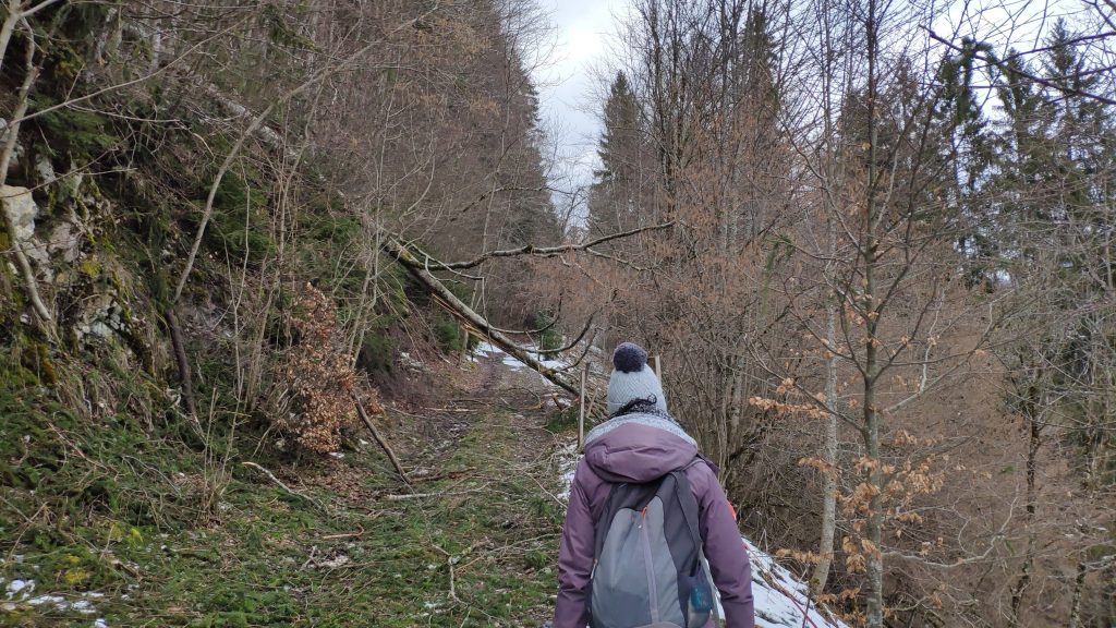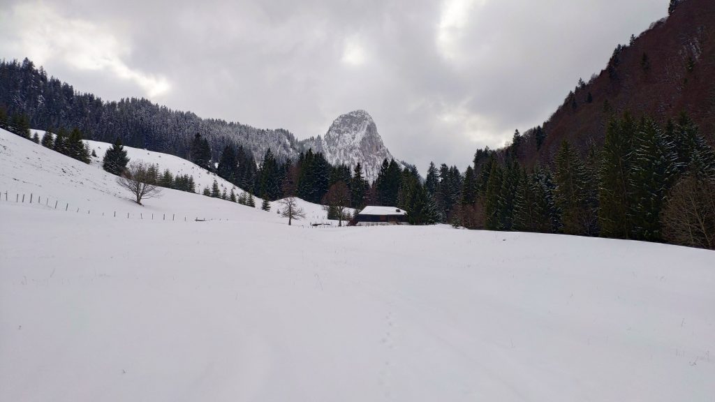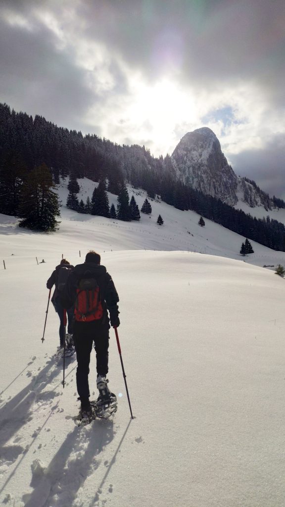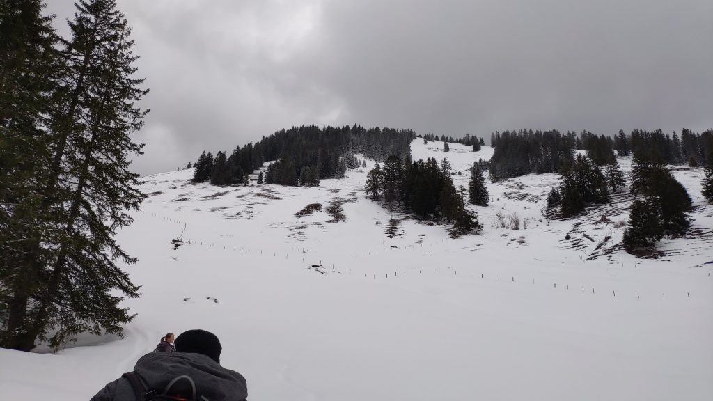 Ensuite vous pouvez suivre le chemin qui monte ou comme nous couper au travers du champ. Au fur et à mesure qu’on montait, la neige commençait à faire son apparition et heureusement car on est venu pour faire de la raquette !