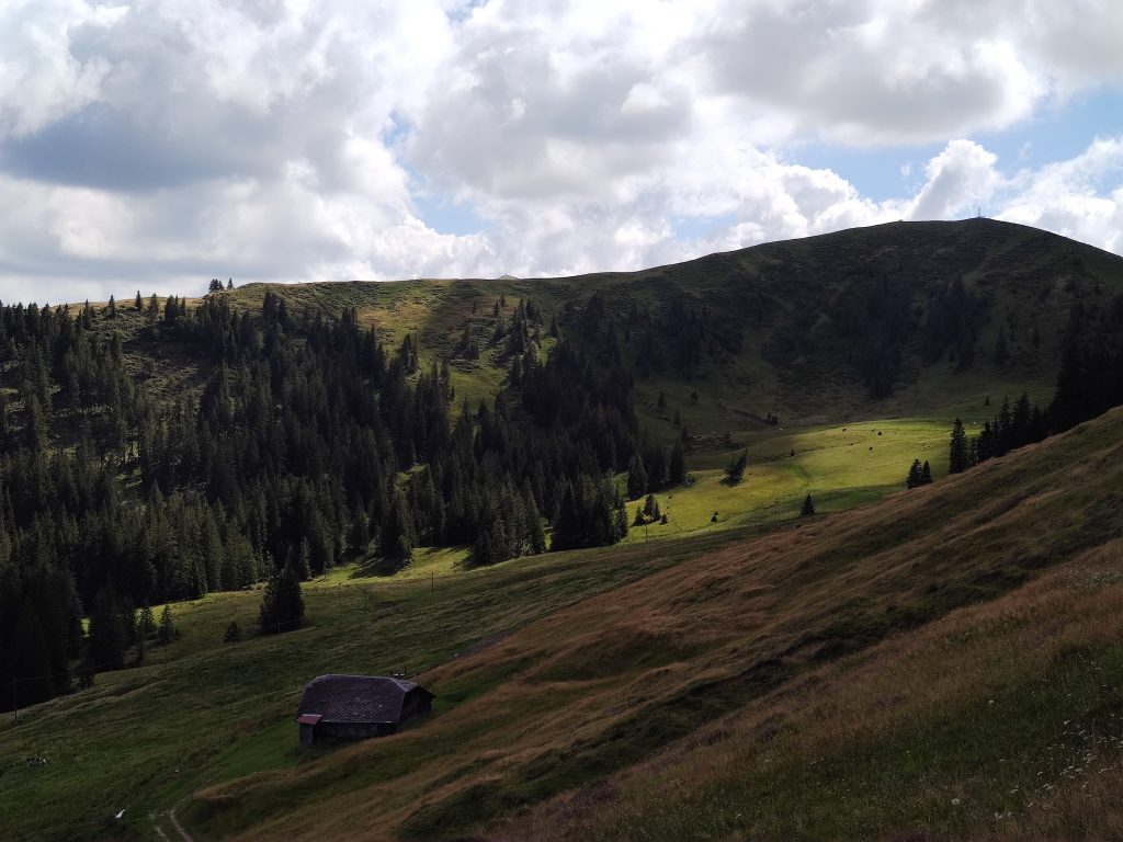 Après quelques minutes de marche, la forêt laisse place aux pâturages de montagne et la vue sur les Préalpes fribourgeoises.