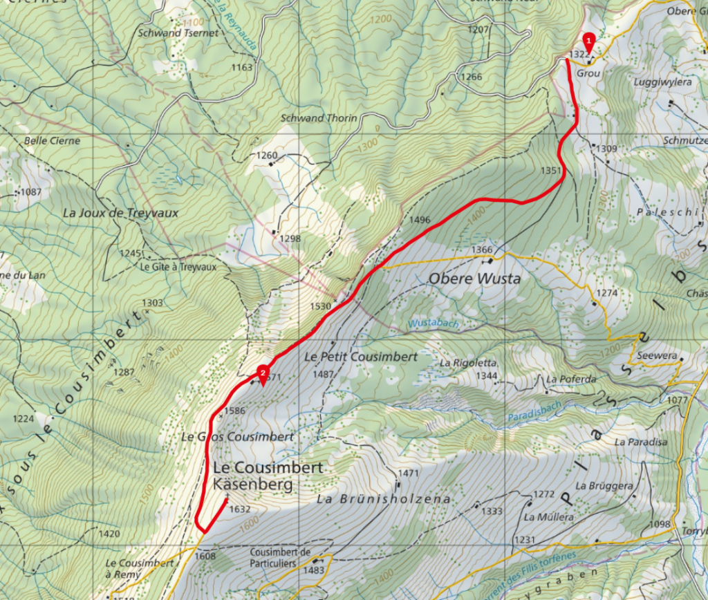 Tout commence au parking de Crau. Normalement vous y trouverez assez de place et dans le cas contraire il y a des places un peu plus bas le long de la route. Depuis là vous pourrez suivre la route d’alpage qui monte vers le Cousimbert.